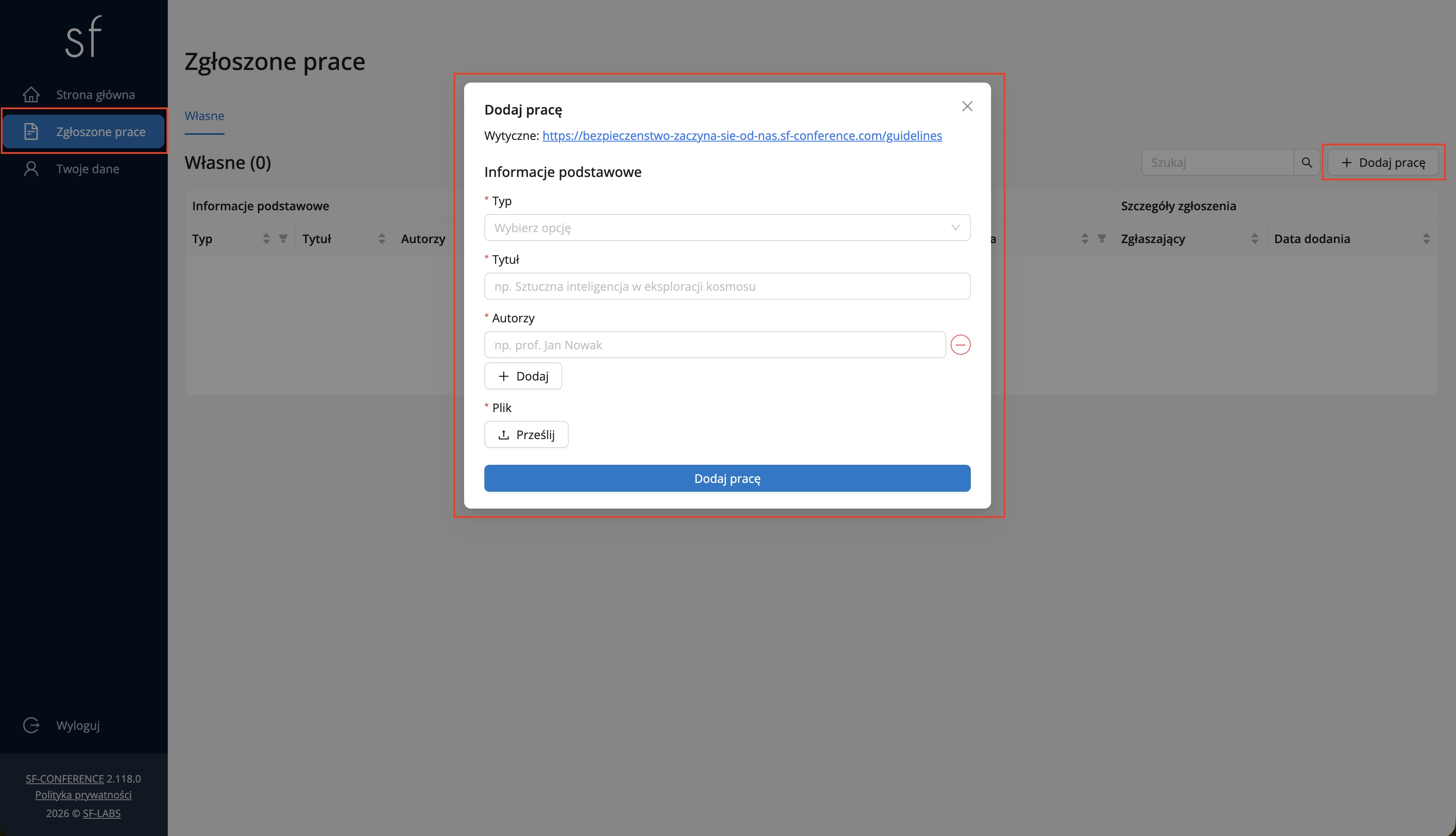 - Przejdź do sekcji Zgłoszone prace i kliknij + Dodaj pracę. Wybierz odpowiedni typ: Streszczenie lub Plakat, podaj wymagane informacje i prześlij plik. Otrzymasz potwierdzenie e-mail, a Twoja praca będzie widoczna w systemie.